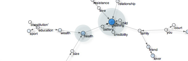 The pattern.graph module provides a graph data structure that represents relations between nodes (e.g., terms, concepts). Graphs can be exported as HTML <canvas> animations (demo). In the example below, more central nodes (= more incoming traffic) are colored in blue.