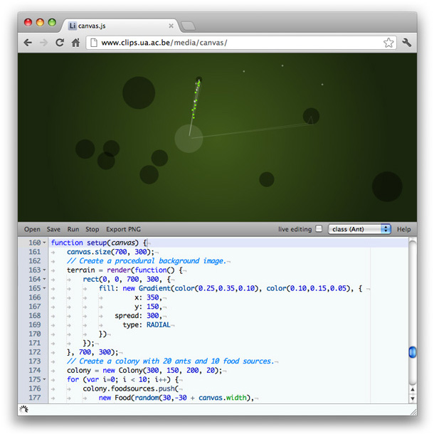 Below is an example script. The HTML source imports the JavaScript canvas.js module with the standard set of drawing commands. Note the <script type="text/canvas"> that defines the animation. It has a setup() function that will be executed once when the animation starts, and a draw() function that will be executed each animation frame.