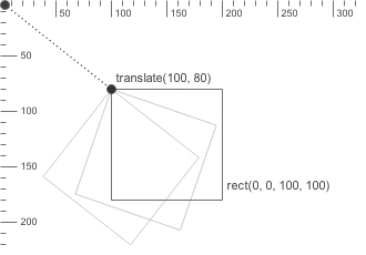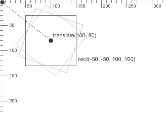 When the origin is translated to (100, 80) and a rectangle with a width of and height of 100 is then drawn at (-50, -50), it will have its center at the origin point, as illustrated in the figure on the left: translate(100, 80) |